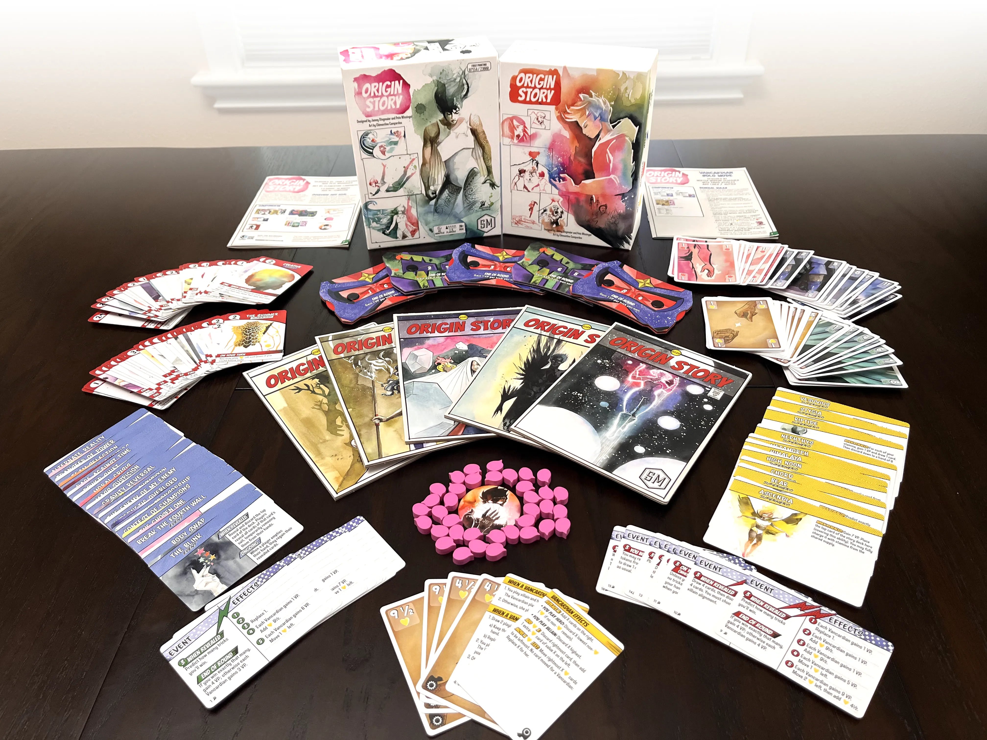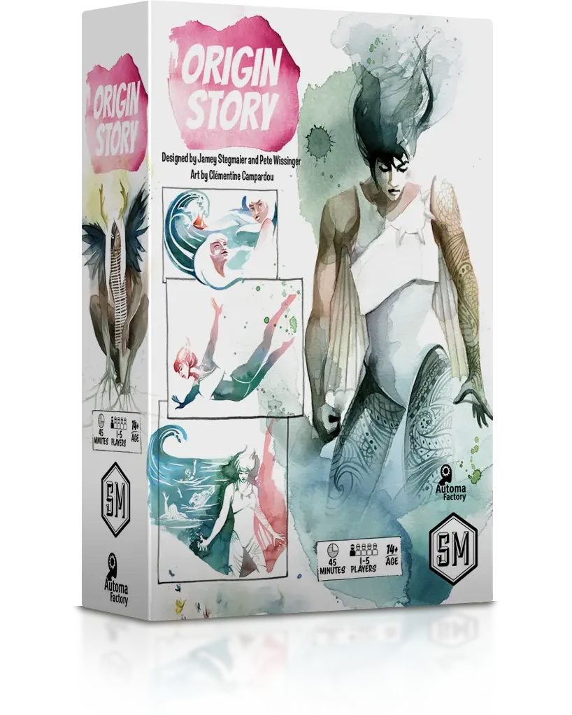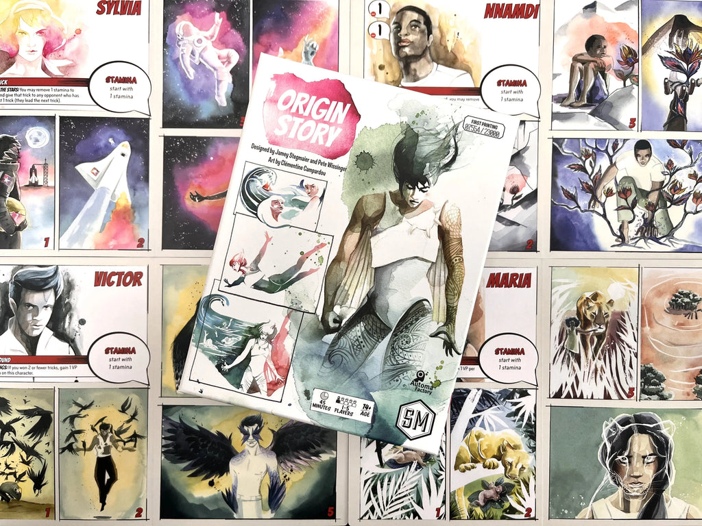 Origin Story is a 1-5 player competitive tableau-building, trick-taking game played over 5 rounds. Each round represents a chapter in your development and grants a new card to add to your player mat. Charge your cards and use their abilities to score more points than your opponents.